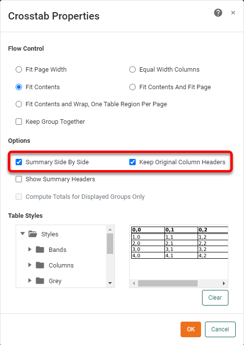 In the Crosstab Properties dialog box, select Summary Side by Side and Keep Original Column Headers.