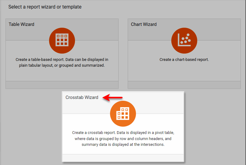 This opens the Ad Hoc Report Wizard. Since we plan to feature a Crosstab in the report, let's begin by selecting the Crosstab Wizard.