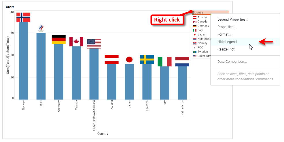 There is no need for the legend in this chart, since the country labels are on the axis, so right-click the legend and select Hide Legend. If there is a legend for the measures, hide that one as well.