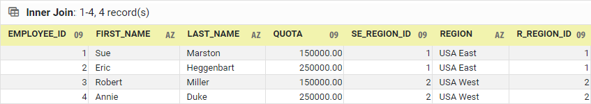 For example, here is the "not equal" join of the original SALES_EMPLOYEES and REGIONS tables: