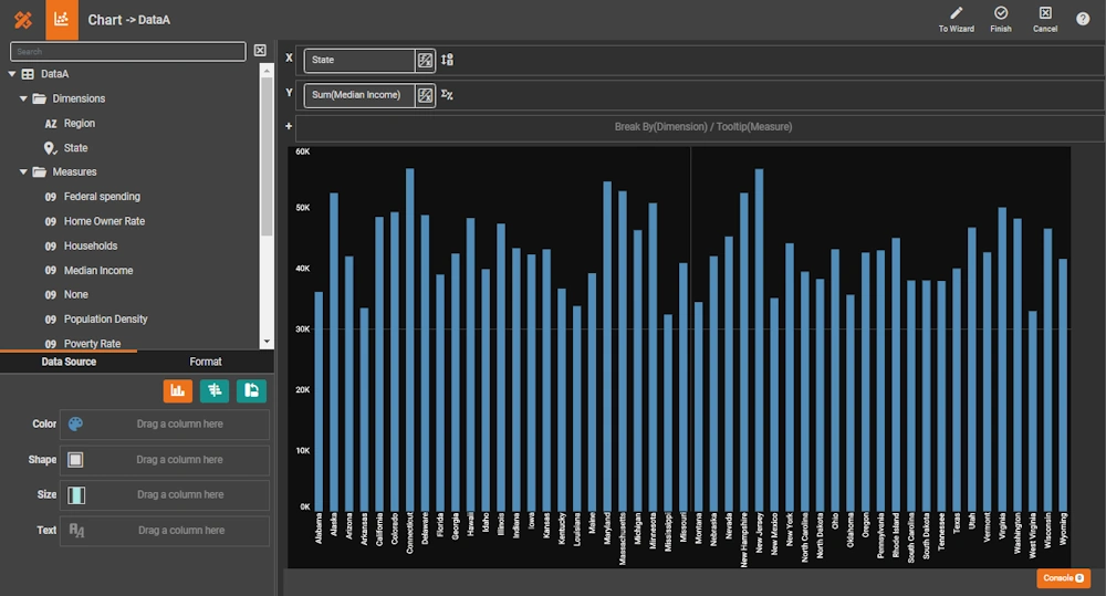 Advanced self-service, including designer-level visualization editing, can be selectively enabled.